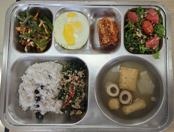오늘급식 페이지 정보 작성자 안미순 댓글 0건 조회 78회 작성일 25-11-03 13:33 목록 본문 일자 : 2025-11-18 .백미밥.어묵국(1.5.6).팟시금치무쌉(5.6.10.13.18).달걀후라이(2).골뱅이무침(5.6.13).렌틸콩자몽샐러드(12.13).배추김치(9.13)에너지 / 단백질 / 칼슘 / 철657.85 / 35.3 / 270.7 / 4.9 이전글오늘급식 25.11.03 다음글오늘급식 25.11.03