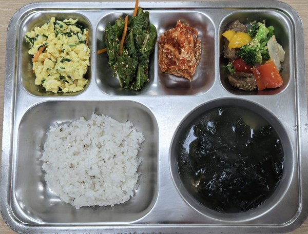 오늘급식 페이지 정보 작성자 안미순 댓글 0건 조회 136회 작성일 25-09-01 13:15 목록 본문 일자 : 2025-09-15 .찰보리밥.쇠고기미역국(5.6.13.16)콩고기숯불구이(1.5.6.12.13.18).부추달걀볶음(1.5).상추겉절이(5.6).배추김치(9.13).푸딩 에너지 / 단백질 / 칼슘 / 철784.4 / 33.1 / 485.4 / 5.8 이전글오늘급식 25.09.01 다음글오늘급식 25.09.01