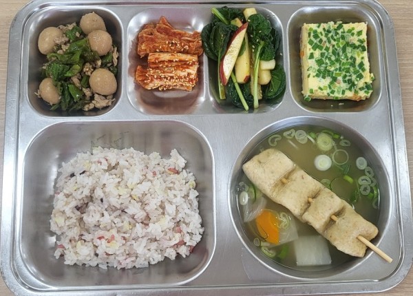 오늘급식 페이지 정보 작성자 안미순 댓글 0건 조회 155회 작성일 25-09-01 13:43 목록 본문 일자 : 2025-09-22 .혼합잡곡밥.꼬지어묵탕(5.6).버터장조림(1.2.10.13).야채계란찜(1.5.6.8).비타민사과겉절이(5.6).배추김치(9.13)에너지 / 단백질 / 칼슘 / 철972.4 / 48.8 / 227.8 / 5.4 이전글오늘급식 25.09.01 다음글오늘급식 25.09.01