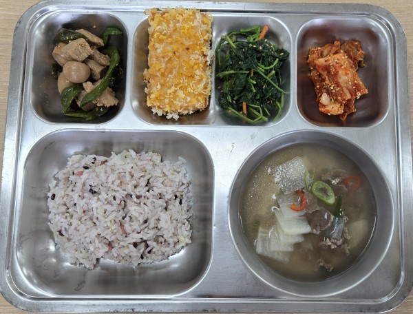 오늘급식 페이지 정보 작성자 안미순 댓글 0건 조회 91회 작성일 25-09-30 13:33 목록 본문 일자 : 2025-10-16 .혼합잡곡밥(5).소고기뭇국(5.16).메추리알장조림(1.5.6.10.13).두부가스(1.5.6.13).취나물무침(5.6).배추김치(9.13)에너지 / 단백질 / 칼슘 / 철815.79 / 34.9 / 238.0 / 5.6 이전글오늘급식 25.09.30 다음글오늘급식 25.09.30