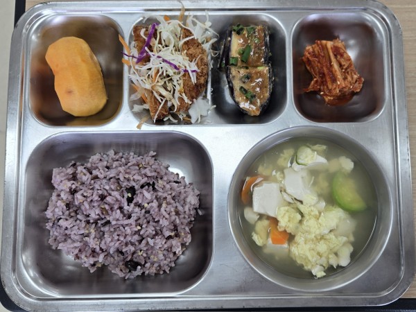 오늘급식 페이지 정보 작성자 안미순 댓글 0건 조회 123회 작성일 25-11-17 13:50 목록 본문 일자 : 2025-11-25 .혼합잡곡밥(5).순두부계란국(1.5.9).아쿠아동가스(1.5.6.10.13).가지된장찜(1.5.6.13).배추김치(9.13).단감에너지 / 단백질 /칼슘 / 철767.8 /22.4 / 135.5 / 3.4 이전글오늘급식 25.11.17 다음글오늘급식 25.11.17