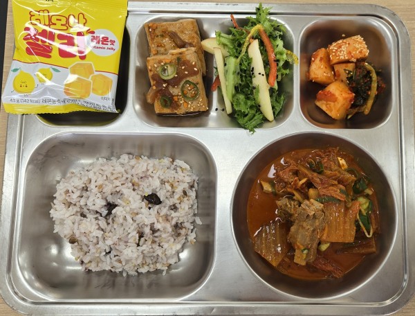 오늘급식 페이지 정보 작성자 안미순 댓글 0건 조회 78회 작성일 25-12-02 13:42 목록 본문 일자 : 2025-12-12 .혼합잡곡밥(5).등갈비김치찜(5.6.9.10.13).두부조림(5.6).치커리사과유자청샐러드(13).총각김치.비타민젤리에너지 / 단백질 / 칼슘 / 철741.8 / 36.8 / 143.8 / 3.7 이전글오늘급식 25.12.05 다음글오늘급식 25.12.02