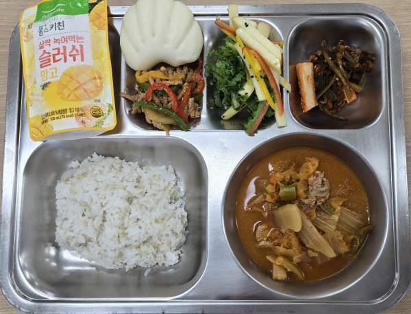 오늘급식 페이지 정보 작성자 안미순 댓글 0건 조회 293회 작성일 25-08-28 13:31 목록 본문 일자 : 2025-08-28 .칼슘발아현미밥.돼지고기김치찌개(5.6.9.10).고추잡채/꽃빵(5.6.10.13.18).치커리사과유자청샐러드(13).총각김치.망고슬러쉬(2.13)에너지 / 단백질 / 칼슘 / 철699.9 / 28.2 / 285.6 /3.2 이전글오늘급식 25.08.29 다음글오늘급식 25.08.27