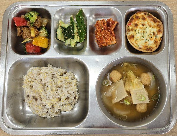 오늘급식 페이지 정보 작성자 안미순 댓글 0건 조회 72회 작성일 25-09-25 14:06 목록 본문 일자 : 2025-09-30 .기장밥.김치어묵국(5.6.9).큐브스테이크(2.5.6.10.12.13.18).오이탕탕이(13).옥수수콘치즈오븐구이(1.2.5.6.10.13).배추김치(9.13)에너지 / 단백질 / 칼슘 / 철 896.3 / 38.6 / 163.7/ 3.1 이전글오늘급식 25.09.30 다음글오늘급식 25.09.01