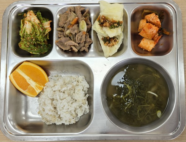 오늘급식 페이지 정보 작성자 안미순 댓글 0건 조회 8회 작성일 26-03-09 12:16 목록 본문 일자 : 2026-03-09 .발아현미밥.쑥된장국(5.6.).양배추쌈/양념장(5.6).돼지고기간장불고기(5.6.10).봄동겉절이(5.6).총각김치(.오렌지에너지 / 단백질 / 칼슘 / 철710.2 / 40.9 / 451.1 / 4.7 이전글오늘급식 26.03.09 다음글오늘급식 26.03.06