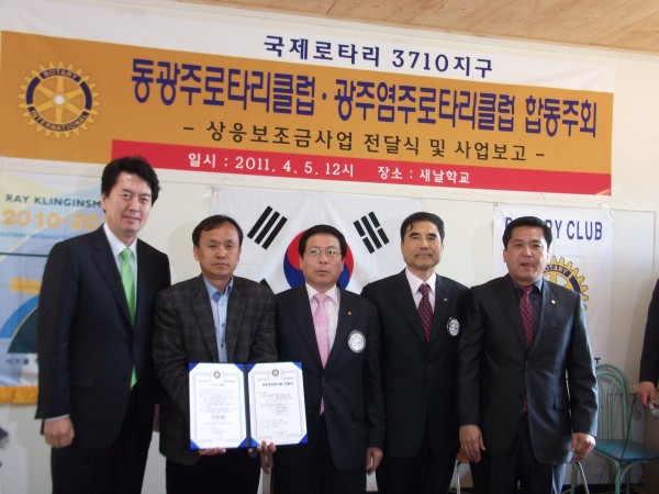 3710지구 동광주 RC 와 광주염주 RC, 3520지구 (Taipei) 화안클럽, 사우스시클럽, 화청클럽, 난데르클럽등이 참여한 상응보조금 사업은 새날학교에 학습용 컴퓨터 4종 19세트를 기증하는 행사였다.