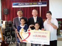 ▲ 김윤기 외환은행 호남본부장은 이천영 새날학교 교장과 학생들에게 운영비 및 급식비 2천만원을 기증했다. --..