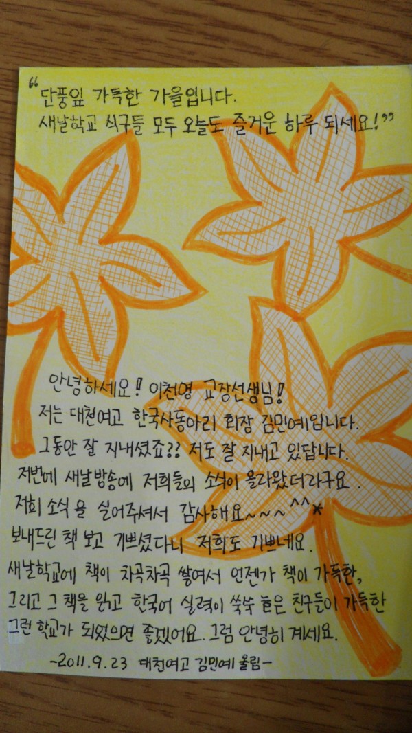 보내드린 책보고 기쁘셨다니 저희도 기쁘네요. 새날학교 책이 차곡차곡 쌓여서 언젠가 책이 가득한, 그리고 그 책을 읽고 한국어 실력이 쑥쑥 늘은 친국들이 가득한 학교가 되었으면 좋겠네요. 그럼 안녕히계세요.