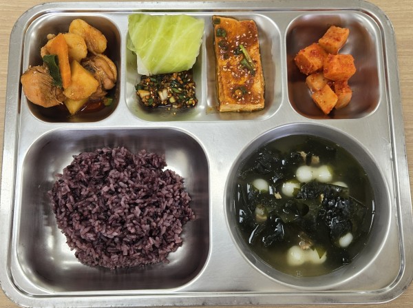 오늘급식 페이지 정보 작성자 안미순 댓글 0건 조회 268회 작성일 25-09-01 13:58 목록 본문 일자 : 2025-09-29 .검정쌀밥.조랭이떡미역국(5.6.13.16).두부조림(5.6.13).닭볶음탕(5.6.13.15).양배추쌈/양념장(5.6.130.총각김치(13)에너지 / 단백질 / 칼슘 / 철682.2 / 39.0 / 255.1 / 4.6 이전글오늘급식 25.09.25 다음글오늘급식 25.09.01