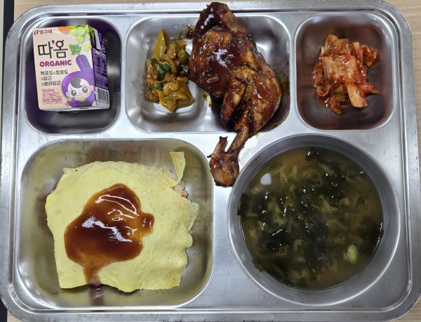오늘급식 페이지 정보 작성자 안미순 댓글 0건 조회 67회 작성일 25-11-03 13:37 목록 본문 일자 : 2025-11-19 .오므라이스(1.2.5.6.10.12.13.15.16).미소된장국(5.6).닭장각구이(5.6.12.13.15).오이지무침(5.6.13).배추김치(9.13)적포도보라당근주스(13)에너지 / 단백질 / 칼슘 / 철1,155.8 / 66.1 / 447.9 / 5.8 이전글오늘급식 25.11.03 다음글오늘급식 25.11.03