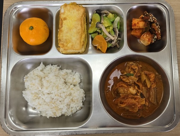 오늘급식 페이지 정보 작성자 안미순 댓글 0건 조회 38회 작성일 25-11-17 13:46 목록 본문 일자 : 2025-11-24 .칼슘발아현미밥.묵은지찜닭(9.13.15).애호박느타리버섯볶음(5.18).두부구이(5.6).총각김치(9.13).귤에너지 / 단백질 / 칼슘 / 철784.5 / 41.22 / 275.6 / 3.9 이전글오늘급식 25.11.17 다음글오늘급식 25.11.03