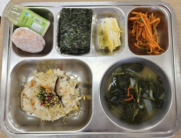 오늘급식 페이지 정보 작성자 안미순 댓글 0건 조회 110회 작성일 25-12-31 14:00 목록 본문 일자 : 2026-01-02 .콩나물밥(5.6).아욱된장국(5.6).무생채.김구이 / 달래양념장(5.6).백김치(13).딸기도넛츠(1.2.5.6).청포도요거트(2)에너지 / 단백질 / 칼슘 / 철506.46 / 18.76 / 203.25 / 3.0 이전글오늘급식 25.12.31 다음글오늘급식 25.12.15