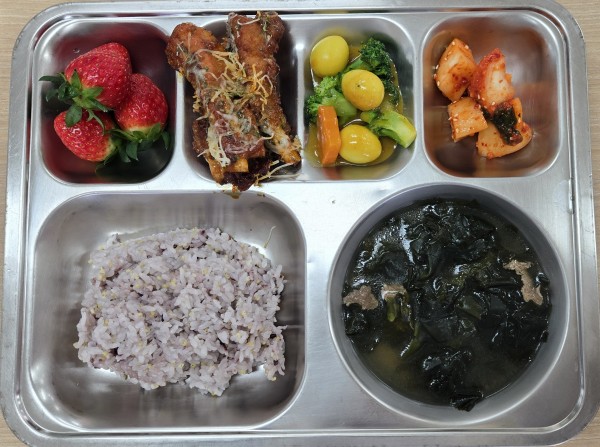 오늘급식 페이지 정보 작성자 안미순 댓글 0건 조회 111회 작성일 25-12-31 14:04 목록 본문 일자 : 2026-01-05 .혼합잡곡밥(5).쇠고기미역국(5.6.9.16).등갈비바베큐폭립(5.6.10.12.13).메추리알카레조림(1.2.5.6.12.13.16.18).배추김치(9.13).딸기에너지 / 단백질 / 칼슘 / 철1.327.4 / 66.8 / 407.3 / 6.1 이전글오늘급식 25.12.31 다음글오늘급식 25.12.31
