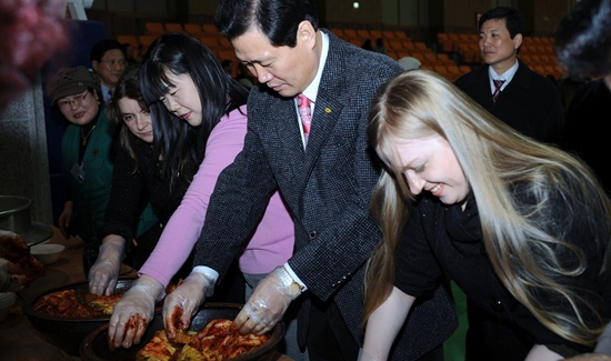 ◇ 전갑길 광산구청장이 지난해 외국인근로자 장기자랑 대회에서 외국인근로자들과 김치를 담그고 있는 모습 ⓒ 데일리안