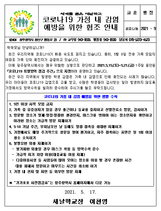 [21-9] 코로나19 가정 내 감염 예방을 위한 협조 안내 > 가정통신문