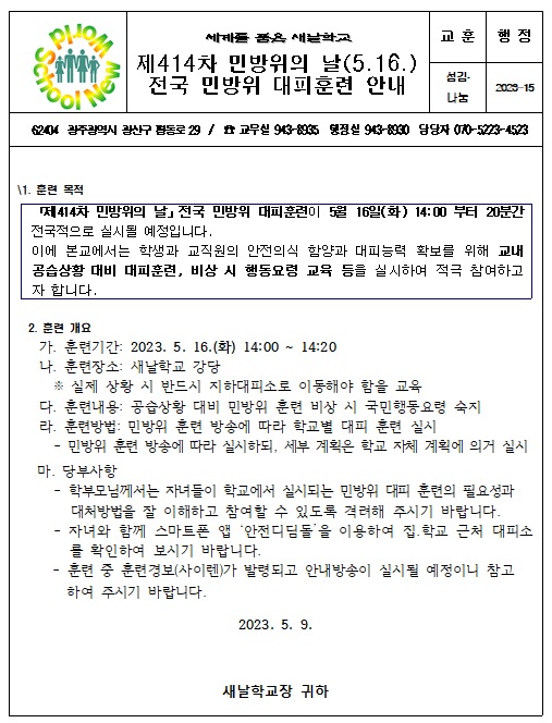 [23-15] 제414차 전국 민방위 대피훈련 안내 > 가정통신문