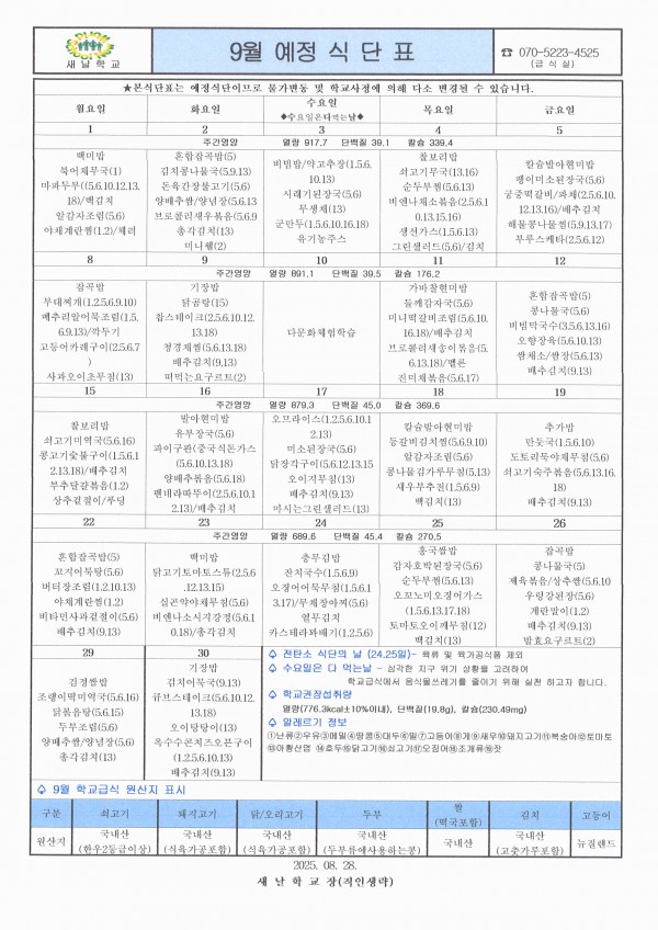 [25-27]9월 학교급식 예정식단표 페이지 정보 작성자 안미순 댓글 0건 조회 450회 작성일 25-08-28 14:24 목록 본문 9월 학교급식 에정식단표 이전글[25-28]9월 학교급식 영양소식지 25.08.28 다음글[25-26] 물놀이 안전체험 및 재난 안전 체험학습 가정 통신문 25.08.18 댓글 0 댓글목록 등록된 댓글이 없습니다.